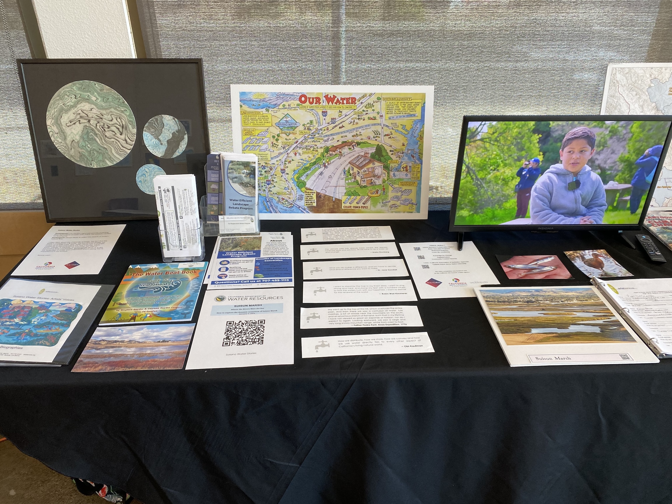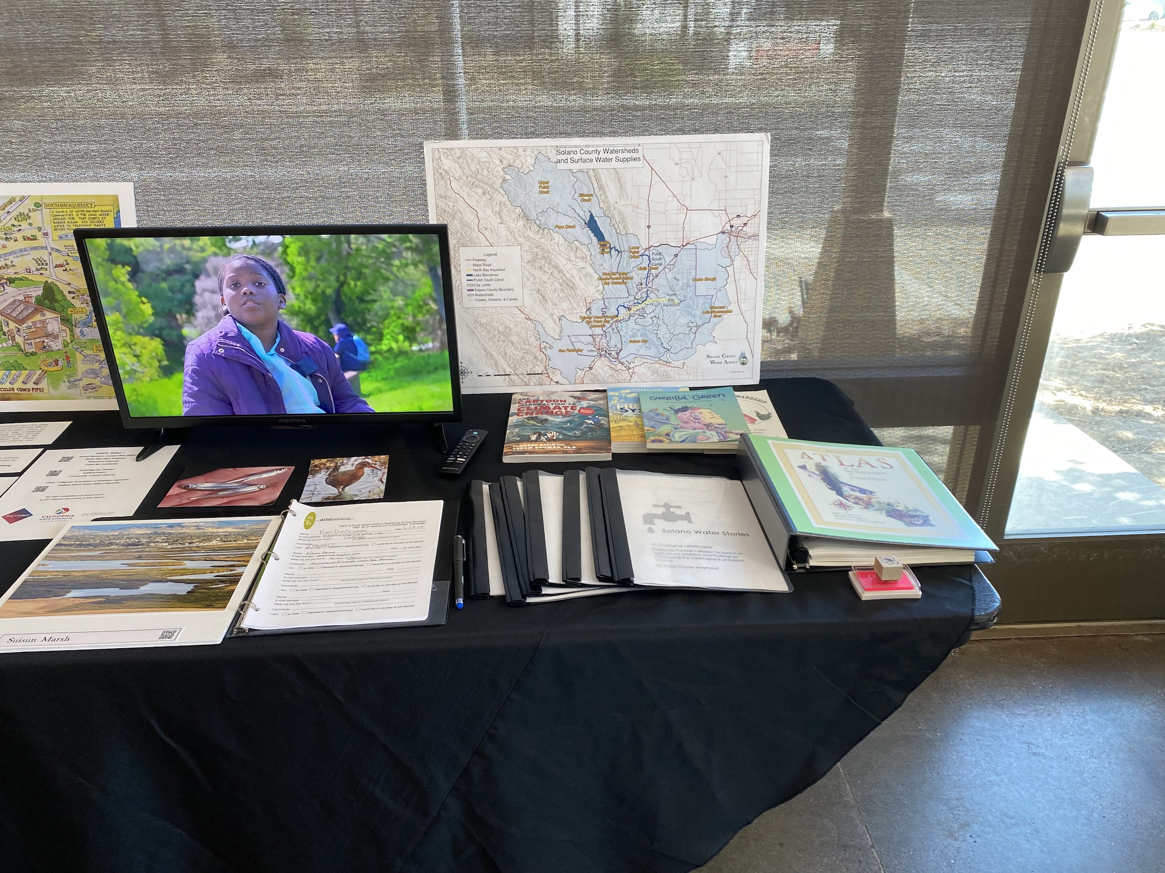 Solano Water Stories Kickoff Exhibition presented the history of water, water conservation, and climate change mitigation practices in Solano County. Designed for all ages, it included information about indigenous history, Solano County history, and current urban, rural and agricultural land and water use as well as ongoing conservation practices. It featured a pop-up library and reading room, original artworks, personal water stories, a poetry corner, watershed maps, water distribution maps, videos focused on site specific water education, sustainable gardening, permaculture, and photographs of protected species and their habitats in Solano County. Additional information was gathered from our partner organizations: Sustainable Solano, Solano Resource Conservation District, Solano Land Trust, and the Solano County Water Agency.